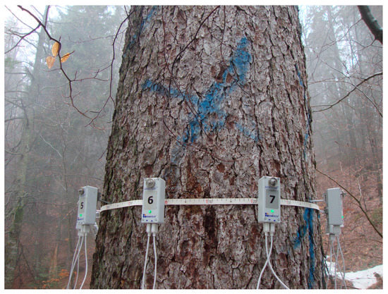 The transverse sound velocity was measured (m·s−1) in the standing trees and discs using the Arbotom sonic tomograph produced by Rinntech [60]. Although in the acoustic tests the longitudinal direction is preferred, the vibratory properties of the wood across the fibre are proportional to those along the fibre [61]. The acoustic measurements in the standing trees were done outside the vegetation season when the wood had an average moisture content gravimetrically determined, of 39% in heartwood and 98% in sapwood, and the air temperature was around 4 °C. The acoustic measurements of the discs were done in the laboratory, at the wood moisture content of 10%. The 15 sensors were put on in the breast height section of the tree, 15 to 20 cm apart (Figure 3). The position of the sensors was established according to the directions on which the coring was done in the standing trees, or the rings were measured in the discs. The sensors were hammered five times with the same force. The software associated to the Arbotom equipment generated the sound velocity matrices and the sonic tomograms.