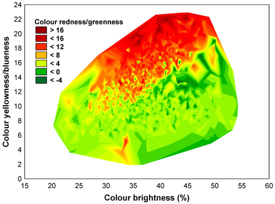 Furthermore, the values of the chromatic components were polarized according to the structural quality class (Figure 6). However, the differences between the structural classes regarding bark scale colour are not major and only refer to one of the scale sides—either the northern or the southern side. After the stratification of the colour components depending on the cardinal points and their position on the scale sides, four chromatic markers of SQC became apparent (Figure 6): bark brightness on the north side, the redness on the back of the south-facing scales, and the yellowness on both sides of the bark. The contribution of tree age was irrelevant: the correlation coefficients between the chromatic coordinates and the tree age are below 0.200, p > 0.04. The tree diameter has a contribution of up to 7.3% to the colour variation.