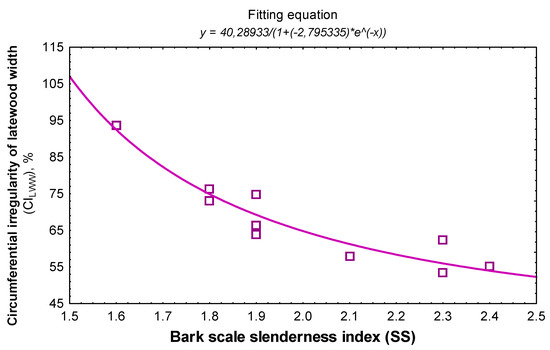 The length and width of the scale’s variation is independent of the wood structure (Spearman rank order correlation ≤0.16, p > 0.09). By contrast, the scale slenderness index is strongly connected to the ring structure regularity (Table 4). The link is even better if tree age is joined (multiple R). If its influence is filtered, the contribution of the scale slenderness index to the estimation of the circumferential irregularity is at least 73% (square partial r). DBH is not determinative in the link between scale slenderness and wood structure (Table 4). The bark descriptor with the closest link to wood structure is the circumferential irregularity of latewood width (Table 4). Logistic growth fitting best describes the link between the two variables (Figure 5). Similarly, the link between scale slenderness and circumferential irregularity of ring width is better expressed by the polynomial model. All these links indicate that trees with better annual ring regularity show high slenderness scales. If the threshold value of the latewood irregularity of 70% [13,59] is applied in Figure 5, then the scale slenderness indices must be at least 1.9 for resonance spruce trees.