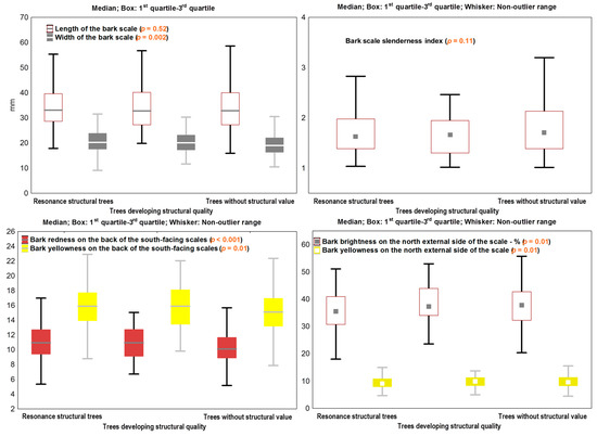 Some of the tree variables were grouped according to the structural quality of the wood; Figure 6 only shows the variables of interest for this research, as well as the variables of bark colour for which p ≤ 0.05. The bark scale slenderness index and length do not appear to be connected with the wood structure quality (Figure 6). However, the bark scales of resonance structural trees are somewhat wider.