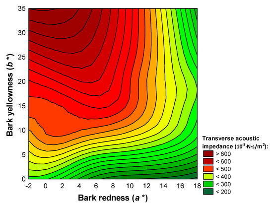 The assigning of bark scale colour to wood acoustic impedance can be observed in Figure 7 and helps to conclude that trees with better acoustic emission have redder and less yellow scales.