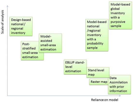 When the scale goes smaller, the pressure to use plots from outside the area (i.e., to use synthetic, model-based estimators) increases []. A possibility in such a case is to utilize a composite of model-based and design-based estimator []. In the extreme case, at the stand level, most stands have zero plots and only a couple of stands have one (or more) plots. Then, a pure model-based approach is the only possibility. For instance, the area-based method used in forest management inventory is essentially a model-based method []. Thus, a model-based approach becomes more and more important as the scale gets smaller. The approaches relying on prior information, such as Kalman filter and/or Bayesian analysis might be used to enhance accurate results [,].