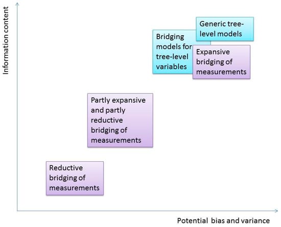 Making a bridging function requires additional data in the case that an expansive bridge is used. In the case that no such auxiliary data exist, the bridging functions from similar conditions from other areas or countries may be used []. This, in turn, involves a risk of introducing bias into the estimators (Figure 2).