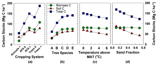 We included this modeling scenario as a benchmark for gauging the effects of the other modeled factors, given that the effects of soil texture on C stocks are well documented [26,27,28]. Soil types vary substantially within the study area and across other potential areas for agroforestry, and soil texture and the fractions of sand, silt, and clay provide a quantifiable approach for modeling the effect of soil type. We hypothesized that C stocks in biomass and soil will decline with the increasing sand content of soil. The rationale is that soils with a higher sand content have a lower capacity for nutrient and water retention and, thus, support less plant growth, therefore lower biomass and soil C [28].