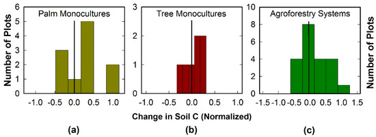 In the field-based measurements, soil C increased rather than decreased in a greater number of plots in palm monocultures and agroforestry systems (Figure 2). Agroforestry systems had the largest relative increases in soil C, whereas tree monocultures had the lowest increases.