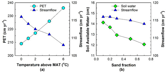 (a) Simulated changes in potential evapotranspiration (PET) and streamflow with increasing temperature. (b) Simulated changes in soil water available for crop/tree survival and streamflow with changes in soil sand fraction.