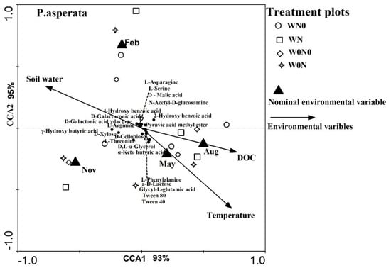 Canonical correspondence analysis (CCA) ordination biplot of treatment plot scores, Biolog substrates, and significant environmental variables. Arrows indicate the direction and relative importance (arrow length) of the environmental variable. Substrates with approximate correlation coefficient >0.20 to the environmental variables are labelled. W0N0: Ambient temperature without nitrogen fertilization; W0N: Ambient temperature with nitrogen fertilization; WN0: Warming without nitrogen fertilization; WN: Warming with nitrogen fertilization. Environmental variables in CCA1 and CCA2 explain 93% and 95%, respectively.