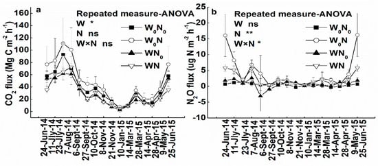 Seasonal changes of soil CO2 (a) and N2O fluxes (b) affected by warming and nitrogen fertilization. W0N0: Ambient temperature without nitrogen fertilization; W0N: Ambient temperature with nitrogen fertilization; WN0: Warming without nitrogen fertilization; WN: Warming with nitrogen fertilization.