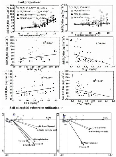 Relationships between the fluxes of soil CO2 and soil temperature (a), MBC (c), DOC (e), soil NH4+ (f) and soil microbial substrates utilization (g), and between the fluxes of soil N2O and soil temperature (b), soil NH4+ (d), and carbon utilization of microbial communities (h) in the different treatments. Q10 values with different lowercase letters indicate significant difference at p < 0.05. W0N0: Ambient temperature without nitrogen fertilization; W0N: Ambient temperature with nitrogen fertilization; WN0: Warming without nitrogen fertilization; WN: Warming with nitrogen fertilization. Different lowercase letters in Figure 3a represent significant differences (p < 0.05) between the treatments using least square difference (LSD) method. Significant * p < 0.05, ** p < 0.01, *** p < 0.001.