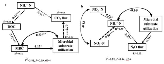 Moreover, soil carbon quality and quantity and microbes, soil N had a significant effect on soil CO2 flux. Previous studies showed that the soil N availability affects the soil C turnover by modifying microbial composition and activity or through its limitation on plant growth [,]. With sufficient C supply, an increase in N availability could stimulate the microbial activity, and accelerate SOC mineralization []. In this study, there was relatively a lack of soil C and no effect on microbial community induced by N fertilization. As a result, N fertilization did not affect the soil CO2 flux. One surprising finding was that soil NH4+-N had a negative effect on soil CO2 flux in this study (Figure 4a). The positive effect of soil NH4+ on soil CO2 flux had been reported in temperate and subtropical forests [,]. The difference between our study and the previous studies may be attributed to the following two reasons. One reason was that spruce prefers to absorb soil NO3−-N than soil NH4+-N []. As NH4+ was strongly absorbed and held to cation exchange sites of SOC and clay minerals, it would lead to declines in labile C compounds and increases in complex C compounds [,]. Thus, soil NH4+ had a negative effect on soil DOC as shown in the SEM (Figure 4a). The second reason was that soil NH4+ had a negative relationship with the microbial substrate utilization (Figure 4), tended to inhibit soil microbial activity and community composition, and resulted in a decrease in the decomposition of SOC []. Therefore, soil NH4+ had a negative effect on soil CO2 flux in this study.