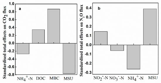 Standardized total effects of soil variables on soil CO2 (a) and N2O fluxes (b) derived from structural equation modelling (SEM). MSU: Microbial substrate utilizations; DOC: Dissolved organic C; MBC: Microbial biomass C.