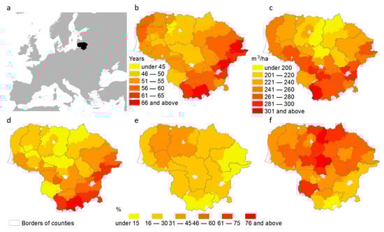 Basic characteristics of the study area to date: (a) Location of Lithuania in Europe, (b) average age of all forest stands, (c) average standing volume in 1 ha, (d) volume proportion of Scots pine, (e) volume proportion of Norway spruce, and (f) volume proportion of deciduous trees (produced based on data from forest state cadaster []).