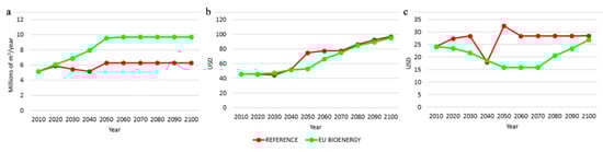Some parameters of the International Institute for Applied Systems Analysis (IIASA) scenarios: (a) Industrial roundwood demand, total harvest, in millions of m3/year, under bark; (b) sawlog prices, national average price per m3 (exchange rate in 2010), at the industry gate; (c) pulpwood prices, national average price per m3 (exchange rate in 2010), at the industry gate.
