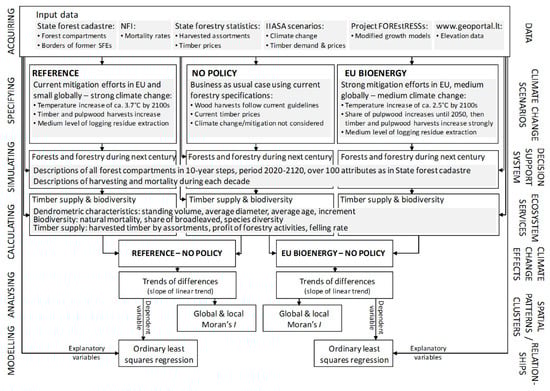 Potential timber supply in the future has been questioned in several national-level studies in Lithuania, like the assessment of Lithuanian forest growing stock potential and its usage applying the simulator Kupolis at the whole country [] and state forest enterprise [,] levels. The potential effects of increased domestic wood use on employment, the economic performance of national forestry, and carbon sequestration were analyzed using the European Forest Information Scenario Model (EFISCEN) []. Forest biomass potential for Lithuania’s energy pathways was discussed using the Landscape simulation and Ecological Assessment tool and the modeling framework for medium- to long-term energy system planning, energy policy analysis, and scenario development (MESSAGE) []. To the best of our knowledge, the national decision support system-driven studies did not consider the effects of climate change on forest growth and forestry.