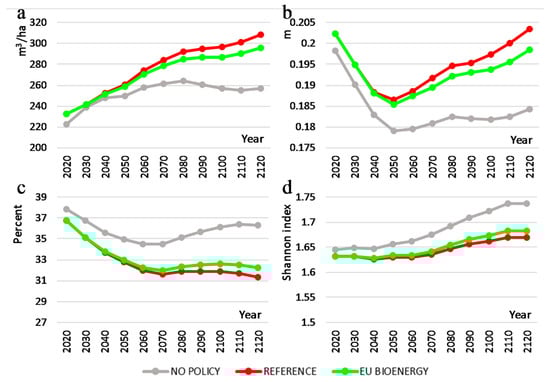 More specifically, standing volume in 1 ha is expected to increase during the whole simulation period; however, it stabilizes and even decreases for the NO POLICY scenario, i.e., if the potentially increasing yields, due to warmer temperatures are not considered (Figure 4a). The average diameter of all stands seems to be decreasing until ~2050 (Figure 4b) and stabilizes afterwards for the NO POLICY case or slightly increases for the other two scenarios, due to the adjusted diameter increase used in simulations. The relative share of broadleaved tree species in the standing volume (Figure 4c), as one of the proxies for biodiversity, is expected to decrease by the midpoint of the simulation period before it stabilizes or even increases. Tree species diversity is expected to increase during the whole simulation period, with less steep trends if climate change effects are included in the simulations (Figure 4d). Average age remains rather stable (52.5–54.5 years) during the whole simulation interval with some drop-down around the year 2050 (Table S1). No climate change effects were assumed on the age of stands, because of specifics of current forest management practices applied in Lithuania and of the Kupolis simulator.