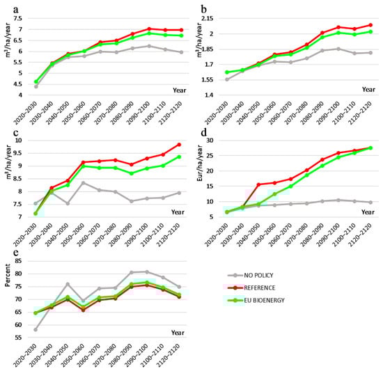 If climate change effects are considered, the annual wood volume increment increase is steeper during the first half of the simulation period, despite the larger yields expected later, due to higher temperatures assumed in REFERENCE and EU BIONERGY scenarios. The NO POLICY scenario suggests relatively small, but slightly increasing profits during the whole simulation period (Figure 5d). However, if climate change effects are included in the simulation, profits from forestry activities are expected to increase rapidly during the whole simulation period, suggesting, in principle, climate change benefits for Lithuanian forestry if only timber supply is considered, neglecting other ecosystem services. Additionally, profits under the EU BIOENERGY scenario, which involves additional human efforts to mitigate climate change, reach the profits of the REFERENCE scenario by the end of the simulation period. Finally, the felling rate (Figure 5e) is always simulated to remain under the margin (i.e., 95%) assumed for a “good” rating following the criteria for sustainable forestry by FOREST EUROPE, the United Nations Economic Commission for Europe, and the Food and Agriculture Organization of the United Nations []. Increased yields under climate change with current forest management approaches usually result in lower felling rates, even though they are increasing during the largest part of the simulation period, before starting to decrease during the last four decades.