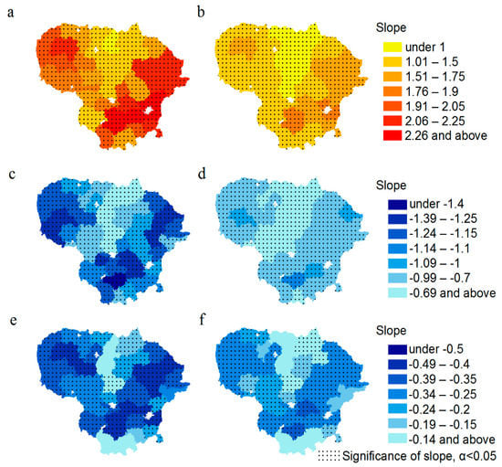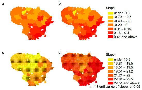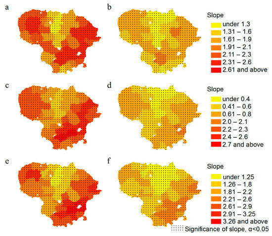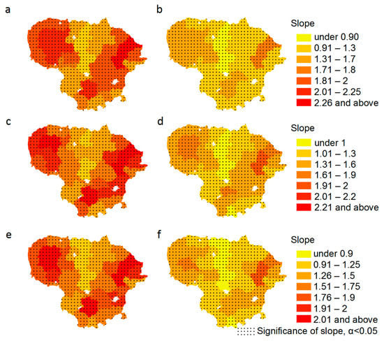 The impact of climate change on the felling rate during the simulation period is relatively low, usually resulting in an insignificant slope (Figure 9). However, spatial clustering is even stronger. The final felling rate is expected to decrease slightly in the south-eastern part of Lithuania and, in contrast, to increase in the northern part, outside the area dominated by deciduous tree species.