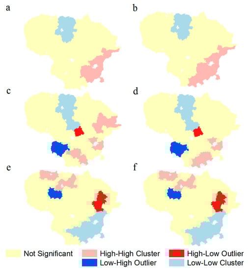 Hot spots, cold spots, and spatial outliers of climate change effects on selected key forestry attributes in Lithuanian forests during the next 100 years from 2020 to 2120: (a) Annual wood volume increment, REFERENCE scenario, (b) annual wood volume increment, EU BIOENERGY scenario, (c) profit from forestry activities, REFERENCE scenario, (d) profit from forestry activities, EU BIOENERGY sIario, (e) felling rate, REFERENCE scenario, (f) felling rate, EU BIOENERGY scenario.