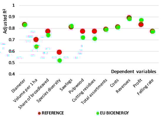 Climate change scenarios used in our study do not consider the development of disturbing factors, such as wind storms, attacks of pests, and diseases. The predictions achieved here are aimed to support strategic or long-term forest planning. Climate change-induced long-term changes in forest growth; however, are considered to have a more significant impact on forest conditions than both harvesting and natural disturbances []. We test only current forest management approaches, i.e., forest management specifications in Kupolis have been defined by best describing current forest management practices in Lithuania [,,], or more precisely, as they have been during the last one to two decades. Lithuania has a strictly centralized forest management system, denying decision freedom of forest managers and owners and involving detailed planning, legal prescriptions, and scrupulous control [,]. Forestry is built around the concept of a normal forest, aimed at maximizing the even flow of timber implemented via forestland zoning by forest functions, strict rotation ages, and area control of age classes []. This makes the consideration of climate change in our projections easier; however, forestry becomes more vulnerable to management decisions made based on biased assumptions about the future. The EU BIOENERGY and REFERENCE scenarios developed by IIASA predict a higher demand for forest products and higher prices, reflecting the human effort to mitigate climate change. In our study, the supply from Lithuanian forests (the felling rate) is bound to the current forest management principles with rigid planning and fixed allowable rotations. Thus, we limited the positive economic effects of the markets to higher revenues following higher prices, but disregarded the potential for more intensive harvests. Increased growth results in larger volumes of harvested assortments and changing forest characteristics, including the ability to provide ecosystem services other than timber supply. Thus, all subsequent interpretations need to be considered in the context of current forest management approaches. The result would change if forest governance and management in Lithuanian becomes less rigidly regulated and more adaptive to future socio-economic contexts and climatic conditions.
