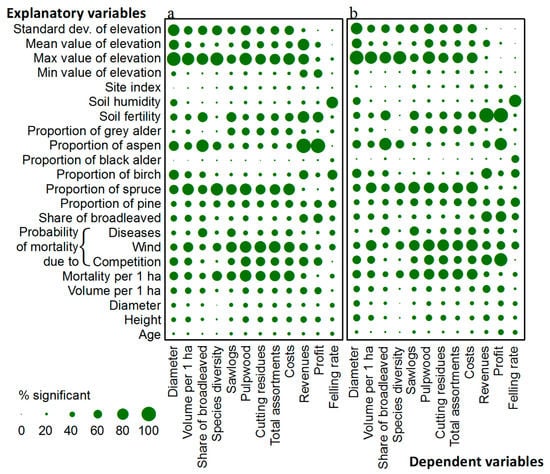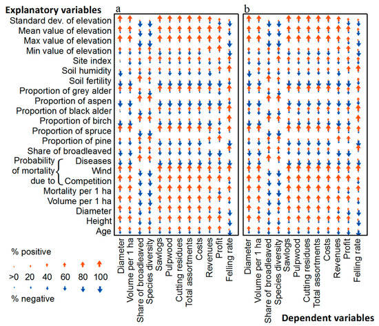 The explanatory variable may have different effects on the changing trajectories of forest development under climate change. Information on the consistency of the relationships of explanatory and dependent variables in regression models is provided in Figure 13. So, the greater the dominance of spruce in current forests, the larger the impacts on the increase in forest productivity-related characteristics. However, spruce causes decreasing biodiversity-related characteristics, like the proportion of broadleaved tree species and species diversity. Opposite impacts are associated with the current proportion of broadleaved species, birch, and aspen. Elevation-related variables indicate positive effects, except for the primarily negative effect on the change of species diversity, the share of broadleaved species and the felling rate.