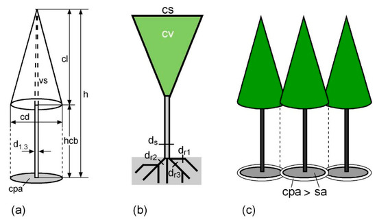 Dendrometrical tree characteristics. (a) Tree height, h, crown length, cl, height to crown base, hcb, crown diameter, cd, tree diameter at breast height, d1.3, and stem volume vs. variable cpa represents the crown projection area. (b) Crown volume, cv, crown surface area, cs, diameter of the stem, ds = d1.3, and diameter of the three tallest roots, dr1 … dr3. (c) Tree stand area equivalent to growing area, sa, and crown projection area, cpa. Particularly in densely packed stands, cpa is often larger than sa.