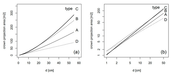 Allometric relationship for four basic types of crown development shown in (a) linear and (b) double-logarithmic representation. The curves A–D correspond with the size and shape development from young to mature trees shown in Figure 3.