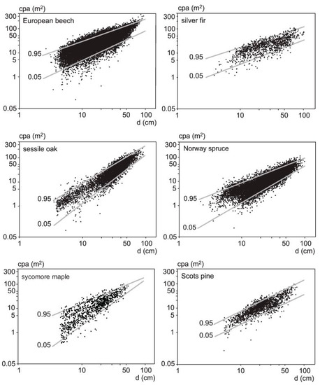 Allometric relationships between stem diameter, d, and crown projection area, cpa, for European beech (Fagus sylvatica L.) (n = 14,898), silver fir (Abies alba Mill.) (n = 1079), sessile oak (Quercus petraea (MATT.) LIEBL.) (n = 4485), Norway spruce (Picea abies (L.) Karst.) (n = 10,724), sycomore maple (Acer pseudoplatanus L.) (n = 942), and Scots pine (Pinus sylvestris L.) (n = 1609) in even-aged and uneven-aged stands. The graph shows the range of crown dimensions measured on long-term experimental plots which cover dense as well as very sparsely spaced stands. The upper and lower lines represent the results of the 95% and 5% quantile-regression . The width of the scattering and the distance between the 95% and 5% quantile regression represents the crown plasticity, CPL. For the statistical characteristics of the quantile regressions see Pretzsch (2014) [10].