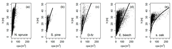The crown space requirement with increasing tree height can also differ considerably between tree species. Figure 5 shows over 30,000 crown sizes measured on long-term experiments in South Germany and the 95% quantile regression line for the cpa-h relationship (inverse function of model 1, see Section 2.4). Whereas the space requirement of Norway spruce (a) increased just moderately with progressing height growth, Scots pine and Douglas-fir (b and c) were more space consuming. The strongest increase of cpa with progressing height development showed European beech and sessile oak (d and e).
