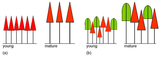 In mixed stands, in contrast, the tree crowns’ space to expand can be wider. If the crown shapes and the light ecology of the combined species complement each other, the trees might simply have more canopy space to occupy. Their mechanical abrasion or penetration of neighboring crowns [54,55] may be lower, as shown in Figure 6b.