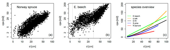 Observations of crown projection area, cpa, and stem diameter, d, on mono-specific long-term experimental plots in South Germany. (a,b) Measurements exemplarily shown for Norway spruce and European beech. (c) Allometric relationships cpa-d for five primary tree species fitted by regression analysis (see model 2 in Table 1).