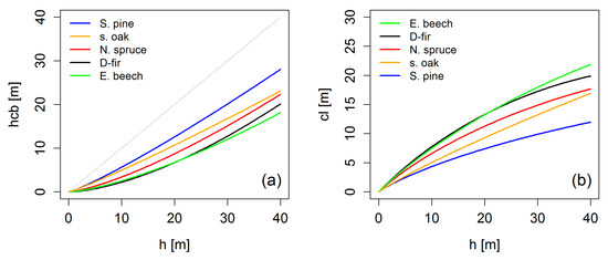 Species-specific (a) height to crown base, hcb, and (b) crown length, cl, for selected tree species growing in fully stocked mono-specific stands. (See model 3 in Table 1).