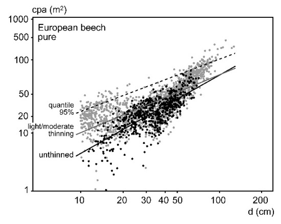 The extent to which a tree may vary in crown extension in different environments is a crucial requirement for its success in coping with crowding. In the following, we use the cpa-d relationship to show the crowns’ reaction to stand density and competition. Figure 9 is based on 2346 crown projection area measurements of beech crowns in monospecific stands with spacing and thinning, ranging from solitary growing conditions to moderate thinning and self-thinning. The stand age ranged from 57 to 207 years. The data came from various thinning experiments in South Germany and was measured in the years 1980 to 2004 (see Pretzsch et al. 2015 [17]). Regressions for the upper 95% quantile (), the group of moderately and heavily thinned stands () and the slightly and unthinned plots () described the broad variation (Figure 9, upper, middle, and lower regression lines). According to these allometric equations, a beech with 25 cm stem diameter occupied 58 m2 when growing without lateral restriction, 27 m2 under medium stand density, and 16 m2 when growing in close to self-thinning conditions. This plasticity equips beech with high competitive strength in intra- and interspecific environments [59,60].
