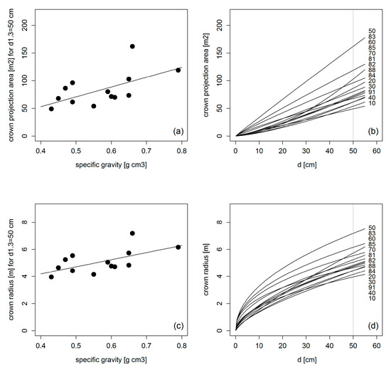 Figure 10 shows a test of this hypothesis, based on mean wood density and allometric crown properties of primary central European tree species. There was a strong positive correlation between the specific wood density R of tree species and their crown projection area or crown radius when they have a stem diameter of 50 cm. To quantify the cpa and cr values for trees with a stem diameter of 50 cm, we calculated 95% quantile regressions, as shown in Figure 10b,d (see model 5 and coefficients in Supplementary Table S1). The wood density was characterized by the dry wood density according to Knigge and Schulz (1966) [63] and Trendelenburg and Mayer-Wegelin (1955) [64]. For the species codes in Figure 10, see column 3 in Supplementary Table S1.