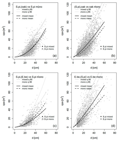 Figure 4 illustrates that crown plasticity can differ considerably between tree species. The data comes from crown measurements on long-term experimental plots in Germany and covers a broad range of tree ages and stand densities, in monospecific and mixed stands [10,17]. Based on the 95%- and 5%-quantiles of the cpa-d- allometry (Figure 4, upper and lower lines), the relative measure, CPL, for tree crown plasticity was derived. Based on the lower quantile line and the upper one , and using a reference stem diameter of 25 cm, the ratio CPL was formulated as follows: . We chose a reference diameter of 25 cm as this is the well-known index diameter of the Stand Density Index, SDI, by Reineke [27]. For a tree with a reference diameter of 25 cm, CPL indicates how wide a crown can range in solitary conditions in relation to maximum restriction. By setting the 95% in relation to the 5% width, any species-specific differences in shape and form (e.g., that beech crowns are, a priori, wider than spruces) are eliminated. The relative measure for tree crown plasticity, CPL, indicates the relative potential for crown expansion which is of particular relevance for competing in mixture.