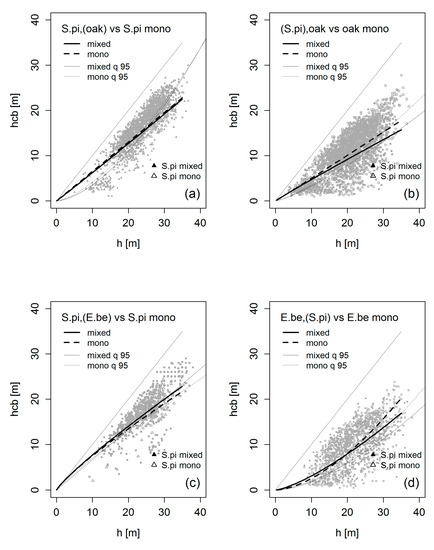 Survival in deeper layers certainly requires shade tolerance; therefore, the hcb is higher for light demanding and lower for shade-tolerant tree species. The ranking of hcb Scots pine > sessile oak > Norway spruce > Douglas-fir > European beech (Figure 8a) correlated with the light compensation points, LCP, of the tree species and their relative minimum light requirement, MLR. The LCP decreases from 27 µmolm−2 s−1 for Scots pine to 13 µmolm−2 s−1 for European beech (Ellenberg and Leuschner 2010, pp. 103–105) [56]. The light compensation points refer to sun leaves/needles in summer for Amax (i.e., when light saturated photosynthesis under normal CO2-concentration). The MLR is 10% for Scots pine and 1.2–1.6% for European beech [57,58]. The MLR quantifies the minimum light requirement of the species in relation to the light above the canopy (100%). The individual trees in mono-specific stands are rather similar in their structural and functional traits. Therefore, apart from some genetic variation and acclimation trees of a light demanding tree species will not be able to survive and fill the canopy below a species-specific minimum of light. However, a second tree species with higher shade tolerance could survive and extend the canopy space, thereby lowering hcb.