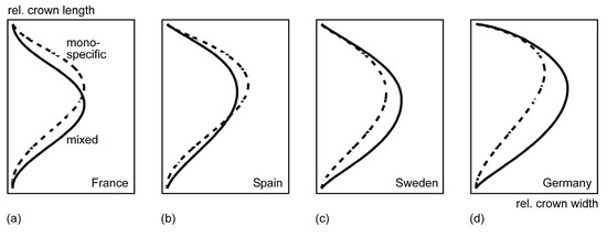 This paper is based on both a review of existing works about crown and stand growth and on the author’s own crown measurement data. The overview of the allometric behavior of different tree species is based on a dataset of in total 39,057 individual tree crown measurements on long term experiments in forests and urban areas [18]. Evidence of the effect of tree species mixing on crown allometry is based on triplets in mono-specific and mixed-species stands in mixtures of Scots pine and sessile/common oak Quercus petraea (Matt.) Liebl./Q. robur L. [19] and Scots pine Pinus sylvestris L. and European beech [17,20] covering in total 10,099 crown measurements in mixed and monospecific stands across Europe. Each triplet consists of three sample plots, two of them in monospecific stands of species 1 and 2, and one in mixed stands where species 1 occurs intermingled with tree species 2. The tracing of the crown size growth from the tree to the stand level is, in addition, based on the long-term mixing experiments of Norway spruce and European beech and sessile/common oak and European beech introduced by Pretzsch et al. (2010, 2013) [21,22], and of Douglas-fir Pseudotsuga menziesii (Mirb.) Franco and European beech published by Thurm et al. (2016, 2017) [23,24]. Most of the stands were derived from planted trees. The sample sizes, measurements, and some cases the original data are reported in the cited publications and not repeated here.