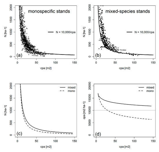 - Third, we show how the individual tree crown allometry translates to species-specific stand density and self-thinning at the stand level in mixed-species stands compared with monocultures.