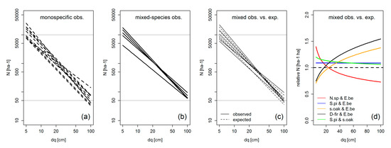 Figure 7c shows the cpa-d allometry in monospecific stands for Norway spruce, Scots pine, Douglas-fir, European beech, and sessile/common oak. This reveals clear species-specific differences in crown expansion that increased with progressing diameter development. In the advanced development stage, there was a size ranking of cpa oak > beech > Douglas-fir > pine > spruce.