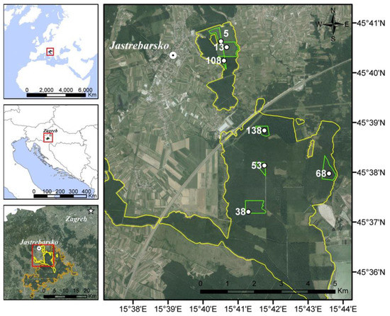 - Čavlović, J. First National Forest Inventory in Republic of Croatia; Ministry of Regional Development; Forestry and Water Management: Zagreb, Croatia, 2010. (In Croatian) [Google Scholar]