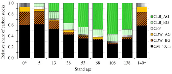 Distribution of carbon stocks by pools in stands of different age. Ecosystem pools: CLB_AG—live aboveground biomass, CLB_BG—live belowground biomass, CFF—forest floor, CWD_AG—aboveground dead wood, CWD_BG, belowground dead wood, CM_40 cm—mineral soil down to 40 cm depth. (* Estimated, not measured; for calculation see chapter 2.6.)