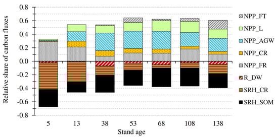 Share of positive and negative carbon fluxes, as well as the share of below- and aboveground carbon fluxes differed between stands of different age (Figure 3). In the youngest stand, SRHCR accounted for 40% of all fluxes and represented the greatest flux. Second flux in magnitude was fine root productivity that made almost 90% of NPP of the five years old stand. At the age of 13 years, SRH decreased and the share of positive and negative fluxes reached equilibrium at 60:40. By the age of 38 years, the share of above- and belowground NPP fluxes stabilized at 71:29. Share of RDW was on average 3.6% of all fluxes.
