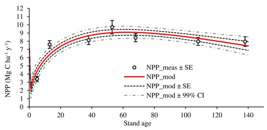 The chronosequence method (space-for-time substitution) is widely used for studying age-related processes in forest ecosystems, e.g., forest growth [16], development of C stocks [6,7,11,29], and modelling ecosystem productivity [12]. This method applies a false time series of individual forest stands with similar structural, soil, and climate characteristics, with a basic assumption that the only difference among the stands is due to their age [30]. Even though there are many shortcomings that are related to this method [30,31], if appropriately applied, the chronosequence approach offers invaluable insights into the temporal dynamics of forest ecosystem processes.