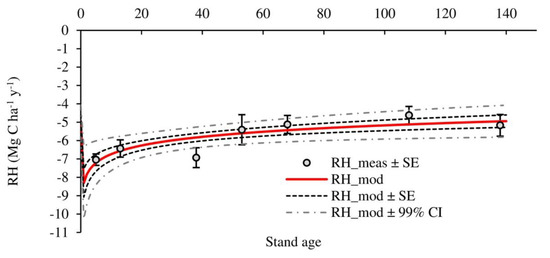 The temporal evolution of the main C fluxes was modelled through time (Figure 4). NPP showed age-related trend and was modelled while using eq. 7 (R2 = 0.98, RMSE = 1.2872, n = 28). Table 4 gives the model parameters. Total heterotrophic respiration (RH) also showed an age trend (Figure 5) and was modelled using Equation (10) (R2 = 0.69, RMSE = 0.6259, n = 6). Parameters of the RH model are given in Table 5. Finally, NEP was estimated from NPP and RH and Figure 6 shows its temporal evolution.