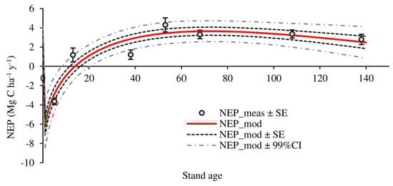 Net ecosystem productivity (NEP; Mg C ha−1 y−1) is considered as a common measure of yearly ecosystem carbon balance and it is calculated either from component-flux measurements or from Eddy covariance Net Ecosystem Exchange (NEE) flux [21]. However, in managed forest ecosystems, where harvests play a crucial role in regulating C dynamics [7,22,23], it is necessary to account for cumulative harvest C losses when calculating long-term net ecosystem carbon balance (NECB) [24,25].