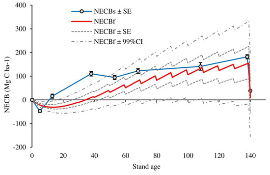 Long-term NECB can be estimated while using two different approaches: (1) pool-change approach, where C balance is calculated as the cumulative difference between C stocks at different stand ages, or (2) component-flux approach, where the C balance is calculated as the difference between the cumulative sum of fluxes in different ecosystem components and cumulative harvest C losses. It should be highlighted that, for short-term (e.g., one year) estimates of NECB, special attention must be given to the changes in the carbon stocks of non-structural carbohydrates (NSC) of trees [26]. However, over a longer period (e.g., decades), the contribution from changes in NSC becomes less important, as annual NSC changes tend to cancel each other out, and the estimates on the NECB from the above two approaches should converge [26]. NECB calculated from pool-change approach reflects long-term dynamics that are mainly related to the past environmental conditions and forest management, while NECB that was calculated from the component-flux approach is related to the current environmental conditions (i.e., meteorology) and management. Under stable environmental conditions and unchanged management, both approaches should yield similar results. However, there are numerous evidences that growing conditions have been changing in the last few decades [4,27] and there are many environmental drivers that can affect forest C fluxes, both in positive (e.g., CO2 fertilization, nitrogen deposition, extension of the growing season) and negative manner (drought, increased respiration due to higher temperatures, new pests, and diseases) [28]. Consequently, C balance estimates from stocks and fluxes can differ and observed differences can be variable across different stand ages.