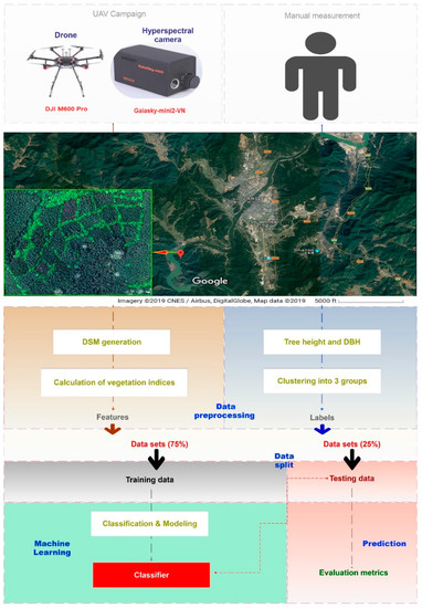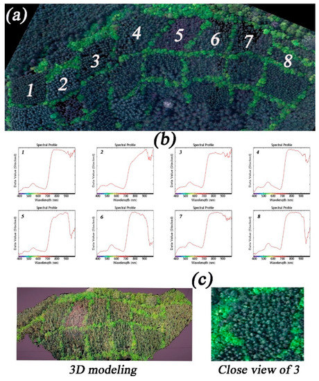 High-throughput phenotyping that uses satellites and aircraft tends to have a low image resolution [8], according to LAND INFO Worldwide Mapping LLC (Littleton, USA), high resolution multispectral or hyperspectral satellite imagery is associated with high costs and non-real-time (must be order than 90 days in archive). However, field-based phenotyping of forests has become possible with recent improvements in unmanned aerial vehicle (UAV) technology. This real-time approach is also precise and it can be conducted at a competitive cost. The UAV approach includes remote sensors, which can adapt to the objectives and more accurately collect measurements [9]. The RGB camera, multispectral sensors, and hyperspectral sensors are frequently used to determine the image traits of trees from the canopy. At the same time, UAV based light detection and ranging (UAV-LiDAR) technology is applied to measure the tree height and DBH [10]. However, LiDAR is extremely hard to conduct comparable measurements in small areas that have a high crown density, or to use in hard-to-reach field areas [9]. Furthermore, the procedure for computing the three-dimensional (3-D) geometric features of individual trees and tree-rows by using multispectral imagery data has been developed for high-throughput phenotyping, it is still difficult to conduct 3-D modeling without the support of accurate mapping level data [11,12]. Unfortunately, a high crown density and a lack of mapping level data support happen in most forestry field trials. Some tasks have been made to provide clues for the solution of the above problems. It has been well documented for several crops that hyperspectral traits of canopies are closely related to biomass (e.g., plant height and diameters), as well as some vegetation indices in the field [9]. Therefore, it is still possible to evaluate the tree height and DBH of the forest with the hyperspectral canopy images. However, to the best of the authors’ knowledge, no similar method has been previously used in the forestry industry for this purpose.