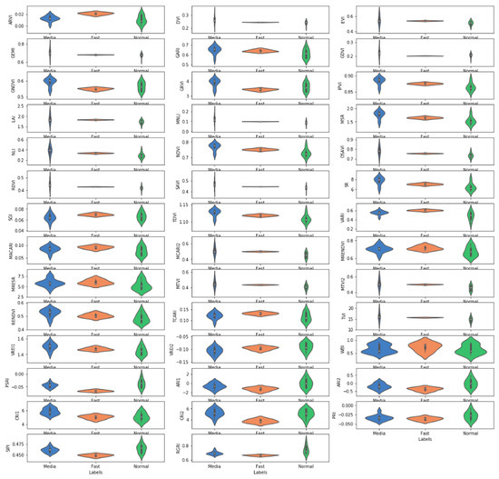 Data distribution of 41 vegetation indices of three clusters. Each column represents the data distribution of the represented group, the mean was represented by the white spot inside the column.
