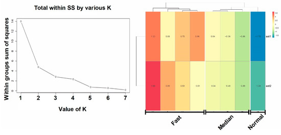 Clustering results of manually collected data on tree height and diameter at breast height (DBH) of Chinese fir in Jiangle, China. (Left) represents K-mean clustering results plotted by the number of clusters and the validity; (Right) shows the heatmap plot against first 2 principal components (set1 & set2 represent tree height and DBH, respectively) of each cluster (Fast, Median, and Normal).