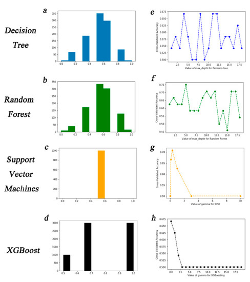 The cross validation of each classifier was evaluated to further improve the model. A maximum depth was set for 1–19 and cross validation accuracy (CVA) was expected to be 0.67 for the decision tree classification (Figure 4e) and 0.75 for the random forest (Figure 4f). We plotted the CVA at different gamma values for SVMs due to the importance of the gamma value (Figure 4g). This showed a cross validation accuracy of 0.71 when the gamma value was 0.03. For boosting, the XGBoost prediction accuracy improved to 0.67 with a gamma of 0 (Figure 4h). The model developed by DT, RF, SVMs, and XGBoost was improved by cross validation, and the model that was generated by the RF algorithm was modified to have the best average prediction accuracy of 0.75 (Table 1), while DT, SVMs, and XGBoost was 0.67, 0.71, and 0.67, respectively.