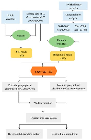 Based on sample data, this paper analyzed the comprehensive habitat distribution in the future climate scenarios of C. deserticola (Figure 1). The objectives of this study consists of five main aspects: (1) evaluate the accuracy of RF model by three evaluation indexes; (2) built a comprehensive habitat suitability model to predict the potential future geographic distribution of C. deserticola and H. ammodendron by considering the limitation of soil conditions; (3) analysis of the dominant climate factors affecting the distribution of C. deserticola; (4) model the core potential geographic distribution of C. deserticola by superimposing the distribution of these two species; (5) analyze the spatial distribution pattern and migration trends of C. deserticola in the future climate change, based on the directional distribution module in ArcGIS. The results of this study will provide some guidance for the division of Chinese herbal medicines and provide the corresponding countermeasures for improving the ecological environment.